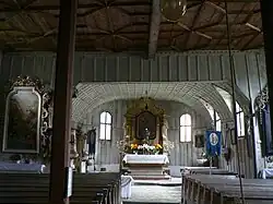 Interiér kostela je zachovaný v původní podobě, s řadou předmětů vnitřního vybavení. Vnitřní stěny jsou obedněny prkny, spáry mezi nimi překrývají laťky. Prkna jsou zdobena renesančním ornamentem v hnědočervené a tmavě šedé barvě. Poněkud netradiční je kazetový strop lodi, členěný pravoúhlými obrazci z lišt. Strop je podepřen dvěma sloupy. Architektonickým skvostem je dřevěná klenba kněžiště – napodobuje pravou klenbu, ve střední třetině tvoří plochý strop. Klenba je zdobena mělkými kazetami, na jižní straně je obohacená dvěma lunetami. Inspirací byla s jistotu klenba kostela sv. Jana Křtitele ve Velkých Losinách. Na západě je umístěn vestavěný kůr, který spočívá na šesti vyřezávaných sloupech. V sakristii je trámový strop. V lodi je dochovaná dlažba z velikých ploten z krupníku, kněžiště bylo předlážděno (1842).[2]