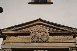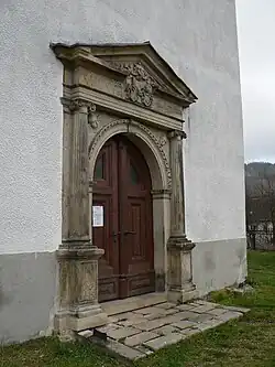 Do kostela se vstupuje v podvěží renesančním portálem. Jde o edikulový portál s ionskými sloupy nesoucími kladí s prolomeným štítem. Ve vlysu je deska s rodovými znaky Vrbnů a Žerotínů a s pamětním nápisem o zbudování kostela s letopočtem 1614. [2]