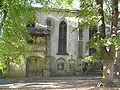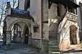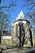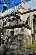 Pod druhým oknem zleva na jižní straně se nachází lomený portál s okosením, dříve sloužil jako postranní vchod. Vlevo od tohoto portálu se nachází vchod na kruchtu, ke kterému vede vnější pískovcové schodiště s kamenným zábradlím a dřevěnou pultovou stříškou. Parapet schodů je zdoben pěti výplněmi se slepou plaménkovou kružbou. Na rozhraní lodi a presbytáře ke kostelu z jižní strany přiléhá sakristie, opatřená štítem z pozdější doby, její hlavní vchod má tvar lomeného oblouku.