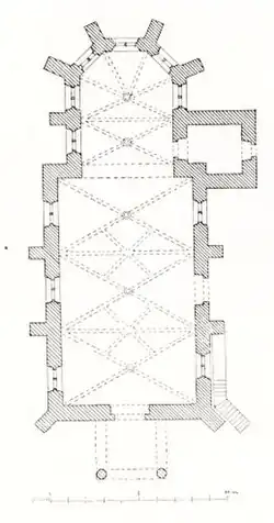 Na nároží jsou šikmo postavené opěrné pilíře s jedním mělkým sestupem v dolní části. Stejný tvar mají i ostatní pilíře běžící kolem celého kostela. Na stranách lodi je umístěno vždy po dvou pilířích, kolem kněžiště pět.