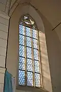 Okna kostela jsou štíhlá s ostře lomeným obloukem, dvojdílná s plaménkovou kružbou, s výjimkou třetího okna zleva na jižní straně kostela, které je trojdílné. Ostění oken v lodi je ploché, v průčelí a v presbytáři jsou ostění žlábkovaná.