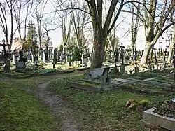 Ke kostelu přiléhá hřbitov, poslední pohřeb se zde konal roku 1966. Šikmo přes ulici se nachází židovský hřbitov.