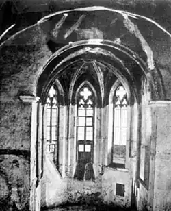 Co se týče interiéru, tam je otázka původního vzhledu ztížena tím, že dochovaný obrazový materiál z doby existence kostela zachycuje pouze exteriér kostela a z interiéru se dochovala pouze jediná fotografie. Je známo, že zatímco prostor lodi byl vybaven valenými klenbami, prostor presbytáře vymezovala klenba žebrová o dvou polích.[25]