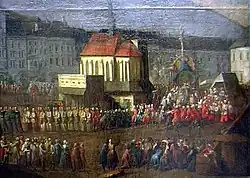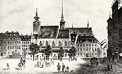 ![]() Svatomikulášský kostel na obrazu Franze Richtera z roku 1829 s přistavěnou budovou městské váhy | |