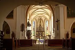 Kostel je směsí rané gotiky, barokní gotiky a novogotiky. Je vystavěn na půdorysu kříže s dlouhým pětiboce uzavřeným kněžištěm. V ose kostela je za kněžištěm připojena šestiboká sakristie. Příčná loď s pětiboce uzavřenými kaplovými prostory. Hranolová věž stojí před západním průčelím podél lodi. Novogotická helma věže má v rozích čtyři vysunuté konzolové arkýře. Zevně má kostel opěráky a vysoká barokně gotická hrotitá okna bez kružeb. Hlavní portál novogotický. Kněžiště sklenuto třemi poli barokně gotické křížové klenby a v závěru paprsčitě žebry. Triumfální oblouk je hrotitý s hrubým klínovým profilem. Boční kaple u příčné lodi opatřeny šestidílnou žebrovou klenbou. Boční prostory příčné lodi sklenuty křížovou žebrovou klenbou. Sakristie sklenuta šestidílnou klenbou s lomenými pásy a v placce v křížení s barokní freskou Posledního soudu. Na čelních obloucích bočních kaplí nástěnné malby od J. Filipa. Figurální okna z let 1907 až 1912. Barokní kazatelnu zhotovil místní truhlář F. Neth v roce 1721, cínová křtitelnice pochází ze 16. století. Ostatní zařízení kostela je převážně novogotické.[6]