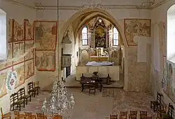 V presbytáři byly odhaleny dvě vrstvy maleb. Starší z nich lze datovat do období stavby kostela, tedy třetí čtvrtiny 14. století. Mezi okny presbytáře jsou stojící postavy světců, z nichž bylo možné identifikovat pouze apoštola Matěje. Mladší vrstvu výzdoby lze datovat do doby po roce 1450. Z této doby pocházejí vyobrazení svatého biskupa a světice nebo světce s knížecí čapkou na severní straně presbytáře. Je možné, že se jedná – vzhledem k černé benediktinské řeholní kápi – o svatého Vojtěcha, druhá postava nabízí více možností (sv. Ludmila, sv. Vít, sv. Václav). Na jižní straně presbytáře lze spatřit anděla s nápisovou páskou se slovy "Ave" a "Gratia". Naproti andělovi, snad archandělu Gabrielovi, je fragment ženské hlavy, snad Panny Marie. Klenba presbytáře nese na klenebních polích obrazy čtyř zvířat, symbolů evangelistů. Na stěnách lodi se nachází fragment christologického cyklu rovněž z doby po roce 1450.[15]