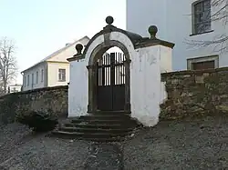 Areál kostela je ohraničen zdí se dvěma bránami, datovanými do let 1821 a 1845.[3] U vstupu je kamenný kříž z roku 1750. V areálu za presbytářem se nachází empírové sousoší Kalvárie, práce místního kameníka L.Ch.Wankeho z roku 1848.[6]