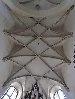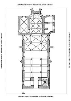Původně dvojlodní kostel byl vystavěn v plochostropé formě s jedním středovým pilířem. V 80. – 90. letech 14. století byly do zdí sakristie a kněžiště usazeny kružbové konzoly a výběhy žeber pevně svázané se stěnou. Přesto kostel nebyl zaklenut, zřejmě z toho důvodu, že kameník před dokončením odešel do Českého Krumlova. Presbytář uzavíral dřevěný strop. K zaklenutí došlo v 1. polovině 15. století, kdy byla vložena nynější síťová žlábkovité zdobená klenba bez svorníků. Žebra však nedosedají přesně na klenební výběhy a jsou zakřivena, což je dokladem práce méně schopného kameníka. Konzoly, ze kterých žebra vybíhají, jsou téhož tvaru jako ty, které jsou v křížové klenbě v augustiánském kostele sv. Jiljí a Panny Marie Královny v Třeboni. Je tedy zřejmé, že zde pracovala stejná stavební huť nebo alespoň tato huť znala prostor třeboňského kostela. Hlavní loď pravděpodobně byla nebo měla být uzavřena hvězdovou klenbou na střední podporu a s obkročným řešením při vítězném oblouku, o čemž svědčí připojené opěrné pilíře a zbytky lomených klenebních čel na půdě.[4]