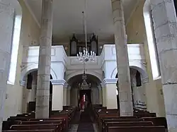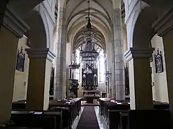 Klasicistní kazatelna byla postavena roku 1820. Trojlodí původně čtvercového půdorysu je nyní sklenuto pouze ve východní části, a to dvěma trojicemi polí s křížovou žebrovou klenbou na dva páry osmibokých pilířů. Západní část je kryta plochým stropem, který také nahradil trojici původních kleneb. U vchodu do kostela stojí klasicistně vystavěný kůr, který nesou čtyřboké masivní pilíře s arkádami. Strop pod kůrem není klenutý. Na kůr lze vyjít točitým schodištěm. Původní gotická okna měla hrotitý tvar. Nyní jsou zbarokizována s kulatým obloukem. Lomené oblouky se dochovaly v části presbytáře.