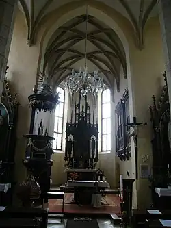 V presbytáři se nachází gotický sanktuář ve zdi se záznamem o svěcení kostela v roce 1493 a s doplněným zápisem o obnově a opravě kostela v roce 1855. Na severní boční straně jsou zbytky pozdně gotické figurální malby z 15. století. Presbytář o třech polích je zaklenut síťovou žebrovou klenbou, zakončenou na kružbové konzoly. Sakristie je oproti tomu o dvou polích zaklenuta křížovou žebrovou klenbou.
