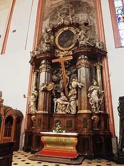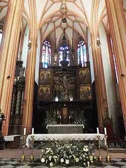 Novogotický oltář byl zhotoven roku 1861 vídeňským sochařem Andreasem Halbigem, který je autorem řezbářských prací a celkové koncepce. Osm výjevů ze života Ježíše Krista na pohyblivých křídlech oltářní archy vymaloval profesor vídeňské akademie Franz Dobyaschofsky.[9][2] Oltář je z dubového dřeva a dosahuje celkové výšky 20 metrů. Oltářní mensa je ze slezského mramoru.[10]