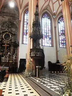 Bohatě zdobená řezbářská práce v neogotickém stylu pochází z roku 1860 a je taktéž dílem Andrease Halbiga. Na třístupňovém baldachýnu kazatelny se nacházejí postavy církevních učitelů a sv. Cyrila a Metoděje. Šestihrannou předprseň kazatelny zdobí výjevy ze života Panny Marie, postavy čtyř evangelistů a sv. Pavla.[10]