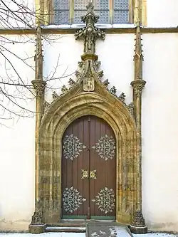 Reliéf s nápisovou deskou (1572) a erbem donátora, po stranách evangelisté Matouš a Marek -
