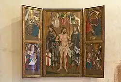 Uprostřed na plátně je světec je vyobrazen jako římský voják. Levicí se opírá o tasený meč, pravici má položenou na prsou. Andílek mu klade na hlavu věnec. Dole jiný andílek drží bílý štít s červeným křížem. Malba je z počátku 18. století. Po stranách obrazu stojí dřevěné sochy sv. Václava a sv. Ludmily. Jak obraz, tak sochy patří do movitého památkového zařízení. Tento komplex snad v roce 1830 nahradil původní deskový pozdně gotický oltářní obraz s postavou Ježíše Krista, sv. Palmacia a sv. Václava, který je nyní uložen v Manské síni (Rytířském sálu) hradu Karlštejn.