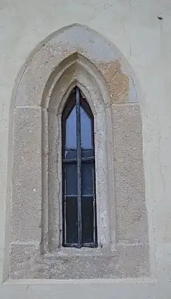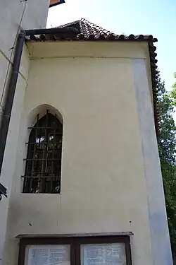 Po jižním boku presbytáře se nachází nízká zděná hranolovitá věž. Ta byla před opravou fasády členěna pouze jednoduchou mezipatrovou a okapní římsou. Průzkum odhalil pouze malované modrošedé lisény a šambrány kolem oken. Římsy byly ve světle okrové barvě základní plochy.