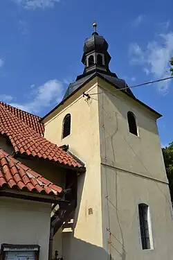 Věž je ukončena plechem pobitou cibulovitou bání. Je z doby po roce 1760, neboť ještě roku 1760 je zmiňována nad klenbou sakristie pouze dřevěná zvonice.