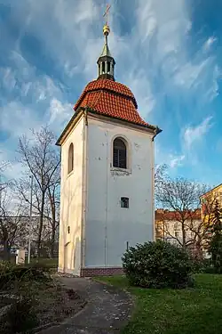 Vedle kostela stojí čtyřboká barokní 19 a půl metru vysoká věž zvonice. Do její severní zdi byla při výstavbě vložena černá kamenná deska s tajemným nápisem. Věž má půlkulatá střílnová okna, osazená střechou s lucernou a makovicí.