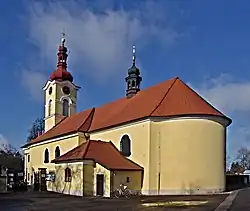 Kostel je pozdně barokní jednolodní stavba obklopená hřbitovem. Presbytář je čtvercový se sakristií na jižní straně. Nad presbytářem je osmiboký sanktusník s cibulovou kupolí, lucernou a makovicí. Střecha kostela je sedlová a krytá bokovkami. Věž je postavena již v klasicistním slohu a měří 33 m.[4] Zakončuje jí cibulová střecha s osmibokou lucernou a makovicí.[5]