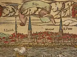- Dne 11. července 1578 byl instalován nový, již třetí kohout. To byl kohout zobrazený na Mollinově panoramatu Rigy z roku 1612 (viz výše).