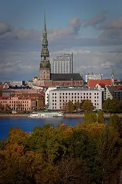 Kostel z blízkého parku Kanālmalas apstādījumi (řeka na obrázku je Pilsēta kanāls, rameno Daugavy) -
