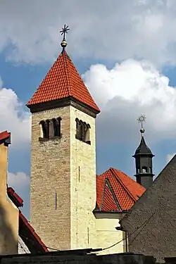 V západní apsidě bylo odhaleno 15 řádků pečlivě kladených kvádříků v interiérovém zdivu. Vstup z apsidy do západní věže byl zřejmě dodatečně prolomen. Špaleta vstupu obsahuje minimálně jeden pískovcový kvádr.