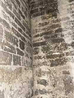 V severozápadním rohu je patrné rozhraní mezi kvádříkovým lícem a lomovým zdivem. Toto může být pozůstatkem odstraněné nárožní lizény, přičemž analýza na protější straně (jižní) není možná, protože je omítnutá.[4]