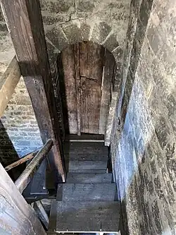 Věž je nejlépe dochovanou částí kostela, s originálními prvky, jako jsou vstupy (na emporu a do podkroví), štěrbinová okna a otvory pro trámy. Má funkci komunikačního propojení stavby a zvonice. Tvoří ji menší stěny (0,70 – 0,90 m), což kontrastuje s mohutností lodi a apsid (1,30 m). Vznikla současně se stavbou kostela, jak dokládá návaznost zdiva mezi apsidou a věží.[4]