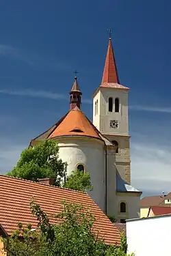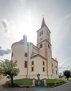 Kostel je podélnou jednolodní stavbou s odsazeným půlkruhovým závěrem. Hranolová gotická věž a sakristie se nachází při jeho severním boku. Při jižním boku je předsíň. Západní průčelí kostela je vrstvené, má volutový štít a v pěti výklencích se nacházely velké dřevěné sochy. Okna jsou ve dvou pořadích: dole jsou obdélná a nahoře půlkruhově sklenutá.[1]