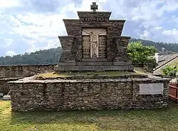 Na místě zrušeného farního hřbitova na jižní straně od kostela je prostranství ohrazené zdí z lomového kamene a rovněž kamenná stupňovitá mohyla vojákům, padlým v první světové válce. Mohyla je pozoruhodným architektonickým dílem konstruktivismu.