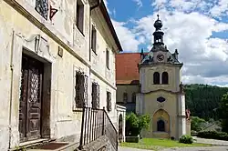 Na severní straně od kostela stojí barokní budova farního úřadu.