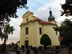 Na hřbitově kolem kostela se nachází několik tepaných křížů z konce 18. století. Ve střední části pseudogotický pomník vojákům pohřbených zde v letech 1782-1785, přenesený roku 1904 ze zrušeného vojenského hřbitova v Karlíně u pražské Invalidovny.
