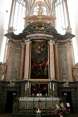 Hlavní oltář byl vystavěn v roce 1695 z pískovce a leštěného štukového mramoru. Jeho autorem je drážďanský dvorní sochař, řezbář a architekt George Heermann (1640–1700). Architektonická sestava se skládá z podstavce s postranními průchody, zakřiveného trojdílného hlavního patra se sloupy, pilíři a štítem a konečně z vysokého nástavce s trojúhelníkovým štítem s předsazenou střední částí, který je bohatě figurativně ozdoben. V hlavním patře oltáře jsou znázorněny nástroje Kristova utrpení, v postranních volutách podstavce jsou figury andělů; nad hlavní římsou jsou evangelisté, závěr nástavce pak tvoří zobrazení křesťanských ctností. Oltářní obraz ukazuje Nanebevstoupení Páně, jehož transfigurace se opírá o Raffaela, na predelle je znázorněno ukládání Krista do hrobu. Železná mříž pochází z roku 1698.