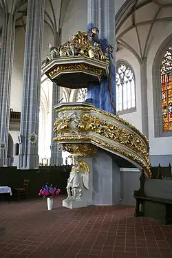Kazatelna je datována do roku 1693. Je z pískovce s bohatou vegetativní ornamentikou v bílé a zlaté barvě. Konstrukce je podpírána figurou anděla, na korpusu kazatelny jsou znázorněni evangelisté. Na dřevěném poklopu jsou apoštolové a proroci.