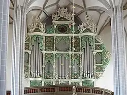 Takzvané „Sluneční varhany“ vznikly v souvislosti s obnovou kostela po velkém požáru v roce 1691, který zničil veškerý pozdně gotický inventář včetně původních varhan. Pozoruhodný je zvláště jejich prospekt, který v letech 1697–1703 ozdobil sochař a architekt Johann Conrad Buchau (1682–1703) plastickými reliéfy 16 sluncí, pročež je tento nástroj označován jako „Sluneční varhany“. Jedná se při tom o obličeje stylizovaných sluncí, z nichž kolem dokola vycházejí malé píšťaly na způsob „slunečních paprsků“. Čtyři z těchto sluncí jsou němá, dvanáct z nich při hraní zní. Jsou totiž součástí tzv. sluneční mixtury jednoho z rejstříků varhan, kde tvoří 12dílnou pedálovou mixturu.[15] Stavitelem původních varhan dokončených v roce 1703 byl Eugenio Casparini (původně Johann Eugen Caspar; 1623–1706), jenž se v tomto oboru vyučil v Itálii. Historické Caspariniho varhany se však nedochovaly, již v letech 1827–1828 byly přestavěny Josephem Schinkem a Carlem Ferdinandem Buckowem, ještě jednou potom v letech 1845–1928 Friedrichem Nikolausem Jahnem. V roce 1894 postavila varhanářská firma Schlag & Söhne ve starém Caspariniho prospektu nové varhany. Ty ovšem byly v letech 1926–1928 nahrazeny novým nástrojem firmy W. Sauer Orgelbau Frankfurt. Od roku 1997 je zde nový nástroj švýcarské firmy Mathis Orgelbau AG. Má 88 zvukových rejstříků (6219 píšťal) na čtyřech manuálech a jednom pedálu.[16]