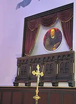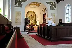 - ↑ Deska s historií a popisem interiéru visí v kostele