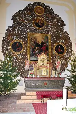 V kostele se nachází několik náhrobníků. Do jižní stěny lodi je vsazen renesanční neidentifikovatelný náhrobní figurální kámen, který býval původně v podlaze. Topograf Sommer pouze zmiňuje, že se jedná o ženskou příslušnici rodu Šliků. Další dva náhrobníky se nacházejí v podlaze těsně před vstupem do sakristie, jsou ale výrazně sešlapány. U fragmentu reliéfní výzdoby jednoho z nich se možná jedná o erb rodu Hrzánů. Na kamenné desce krypty je reliéfní znak rodu Písniců. Poslední mužský potomek Písniců, Julius Jindřich (zemřel v roce 1773 v Chebu) prodal panství roku 1761 své neteři Marii Josefe, provdané hraběnce Bredové. Sňatkem její dcery Marie Anny s hrabětem Leopoldem Auerspergem přešlo panství do majetku tohoto šlechtického rodu. V hrobce jsou tak uloženy také ostatky členů rodu Bredů a Auerspergů. Jako poslední byla do hrobky roku 1901 pochována hraběnka Františka Auerspergová. Raně barokní erb je velice dobře zachován.[4]
