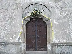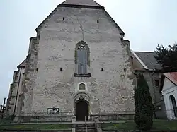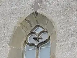 Na nárožích podstřešní římsy kostela na nacházejí figurální symboly. Západní vstupní portál má tvar sedla, je členěný protnutými pruty, do nich jsou v horních rozích vložené štítky.