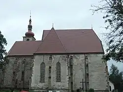 Kostel sv. Petra z Alkantara je trojlodní halový kostel s dlouhým polygonálně ukončeným kněžištěm. Hlavní loď i se dvěma vedlejšími je zastřešená strmou sedlovou střechou. Nad kostelem se vypíná věž zastřešená cibulovitou střechou v barokním slohu. Její výška dosahuje 40,2 m a jedná se o obrannou věž, jak jde posoudit z drobných okének v nižších patrech věže. V posledním podlaží se z každé strany věže nachází sdružené okno v románském slohu, které propojuje malý, úzký meziokenní sloup. Fasáda věže je ukončena římsou.