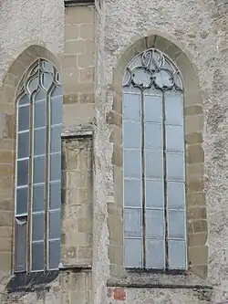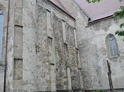 Stěny kostela člení 11 oken v gotickém slohu, ve tvaru přímého lomeného oblouku, vyplněné kružbou (symetrickou). V polygonální apsidě jsou čtyři trojpolová gotická okna, vyplněná kružbou ve tvaru trojlalku a čtyřlístku. Opěrný systém je vtažen do průčelí fasády kostela. Odstupňované opěrné pilíře jsou ve tvaru jednoduchého proláklého obdélníku. Kostel byl postaven z opracovaného lomového kamene.