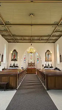 Loď i presbytář jsou plochostropé. Celý strop je obložen dřevěnými prkny s malovanými florálními ornamenty. Je členěn do kazetových polí, oddělených lištami s pozlacenými hranami. V centrální ose lodi visí dominantní zlatý lustr. Na zadní stěně se nachází vyvýšený kůr s varhanami. Je celodřevěný, s jemným kazetovým členěním. Boční stěny obsahují obrazy svatých v bohatě zdobených rámech a menší oltáře. Na těchto stěnách se také nachází vitrážová okna s lomenými oblouky. Lomeným obloukem je také vybavena stěna rozdělující hlavní loď od presbytáře.