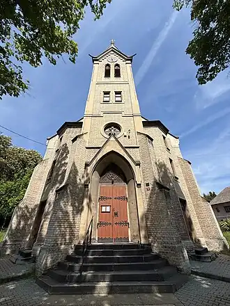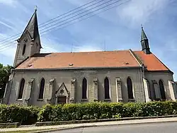 Kostel je jednolodní, s obdélníkovou lodí a polygonálně zakončeným presbytářem. Orientace stavby je netradiční – osa směřuje od jihu k severu. Dominantním prvkem je čtyřpatrová čtyřboká věž o výšce 32 metrů, umístěná při hlavním průčelí. V přízemí je vstupní portál. Nad portálem je nezdobená rozeta. V nejvyšším patře jsou dvě okna ukončená lomeným obloukem. Ostění je velmi jednoduché. Vstup na věž je zabezpečen točitým schodištěm umístěným vedle portálu, které má vlastní vchod.