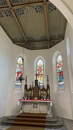 Presbytář je polygonálně zakončen. Oltář v kontrastu s celou stavbou je sice menší, ale monumentální a bohatě zdobený – dřevořezby postav svatých a gotizující architektura oltářního retabulum. Za oltářem jsou tři vitrážová okna s postavami svatých – svatý Václav, svatý Prokop a archanděl Michael.