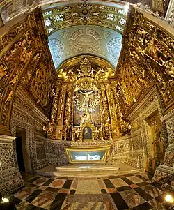 Po stranách vstupního oblouku se nacházejí výklenky s polychromovanými plastikami světců z 18. století – Longina vpravo a Veroniky vlevo.[50] To byl nový aspekt, který přispěl ke vzniku „divadelního“ stylu ve výzdobě portugalských kostelů. V tomto případě působí tito světci jako diváci ústřední scény: Kalvárie a Piety na scénickém pozadí namalovaném na panelu, který uzavírá oltářní obraz. Monumentální sacrarium s obrazem Panny Marie Bolestné[51] a „krajka“ andělů obklopující paprsky z krucifixu jsou typickými prvky lisabonské dekorativní školy. Ve skleněné vitríně pod oltářem je socha Panny Marie Šťastné smrti z 19. století.[52] Na bočních stěnách je několik výklenků obsahujících relikviáře ze sbírky Joãa de Borja, lemované dvěma páry karyatid, alegorických a divadelních postav charakteristických pro vkus na počátku 18. století.