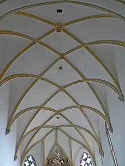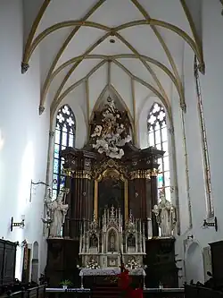 K severní zdi kněžiště přiléhá čtyřboká sakristie s depozitářem v patře. Po bocích přiléhají k obdélné lodi kaple – na jihu kaple sv. Anny, která je ze tří stran volná a na severu kaple Těla Kristova, vložená mezi novou sakristii a přízemí věže. Mohutná hranolová věž je přiložena k severnímu boku lodi a lícuje se západním průčelím. Je vysoká 72 m a má 8 poschodí. Na západě je k věži přiložen schodišťový válec a k lodi čtyřboký vstup se schody na kruchtu. Kněžiště je zaklenuto síťovou žebrovou klenbou, klínová vyžlabená žebra se protínají v drobných kruhových svornících, překrytých reliéfními rozetami. Žebra končí ve stěně kněžiště na konzolách. Do lodi se kněžiště otevírá kamenným vítězným obloukem s lomeným záklenkem. Loď má čtyři pole křížové žebrové klenby, žebra z cihlových tvarovek jsou překrytá maltou. Trojice žeber na severní zdi dvou západních polí končí na pozdně gotickém, umělecky hodnotném kamenném konzolovém útvaru s reliéfem františkánského mnicha (snad sv. František z Asisi), držícího v ruce kříž a knihu s nečitelným textem. Pod světcovýma nohama je štít s korunovaným dvouocasým lvem, nad světcem polygonální baldachýn s kružbami. Kaple jsou zaklenuty valeně, s výsečemi mezi pasy.[4]