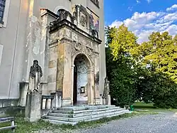 U vchodu do sakristie, který se nachází na západní straně kostela a v současnosti je opatřen mříži z dílny uměleckého kováře Filipa Smyčka, je vyobrazení Matky Boží s dítětem, kam pacienti často přicházejí zapálit svíčky a vyslovit své modlitby, když je kostel zamčený.[2]