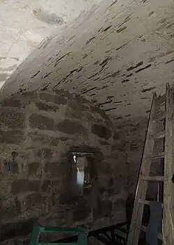 Na jižní straně je ve zdi vsazené sedile, rozdělené do tří částí. Uprostřed je nesené na dvou krakorcích, na které dosedají tři polokruhově sklenuté oblouky. Všechny tyto prvky jsou tvořeny ze žulového kamene. Výklenek je umístěn 0,57 m nad podlahou, je 0,37 m hluboký, 1,84 m široký, 1,5 m vysoký a oblouky mají 0,45 m v průměru.[1][4]