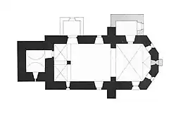 Ze severní strany přiléhá k presbytáři obdélná sakristie. Vchodem umístěným na východě je přístupná z exteriéru a je osvětlena oknem eliptického tvaru na severní stěně.