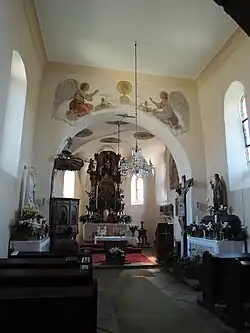 Oltáře na stranách jsou velmi jednoduché. Na levé straně je zasvěcen Panně Marii Lurdské a na straně pravé srdci páně. Na tomto oltáři jsou v dolní části ostatky svatých (možná z kostelního nálezu v roce 1780).