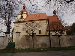 Na západní straně od kostela byla r. 1770 postavena socha sv. Jana Nepomuckého s nápisem: DIVf pater pairIae beLLo faMe pesteqVeLassIs oro patrIotIs patroCInaretVIs , Svatý otče vlasti, prosím zastaň se svých krajanů zkoušených válkou, hladem a morem Sečteme-li velikostí zvýrazněná písmena (římské číslice) dostaneme letopočet 1772, zajímavé je, že ve slově pairIae je první i nezvýrazněné, pokud jde o chybu tak je letopočet postavení sochy 1773. Na severovýchodní straně kostela se nalézá budova Římsko-katolické farnosti - zmínka o zdejší faře je z roku 1384. Základní kámen nynější fary byl položen16. června 1873. Na jižní straně pak r. 1854 postaven železný kříž na památku zasnoubení Jejich C. K. veličenstev Františka Josefa a Alžběty Bavorské.