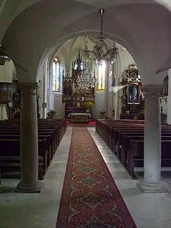 Presbytář má gotickou křížovou žebrovou klenbu ze 2. poloviny 14. století, která je položena na figurální konzoly. Do sakristie směřuje sedlový portál. V kostele je nástěnný gotický sanktuář. Loď má valenou klenbu s lunetami. Kruchta je renesanční, nesená pěti oblouky na toskánských sloupech. Kruchta je podklenutá křížově.[2]